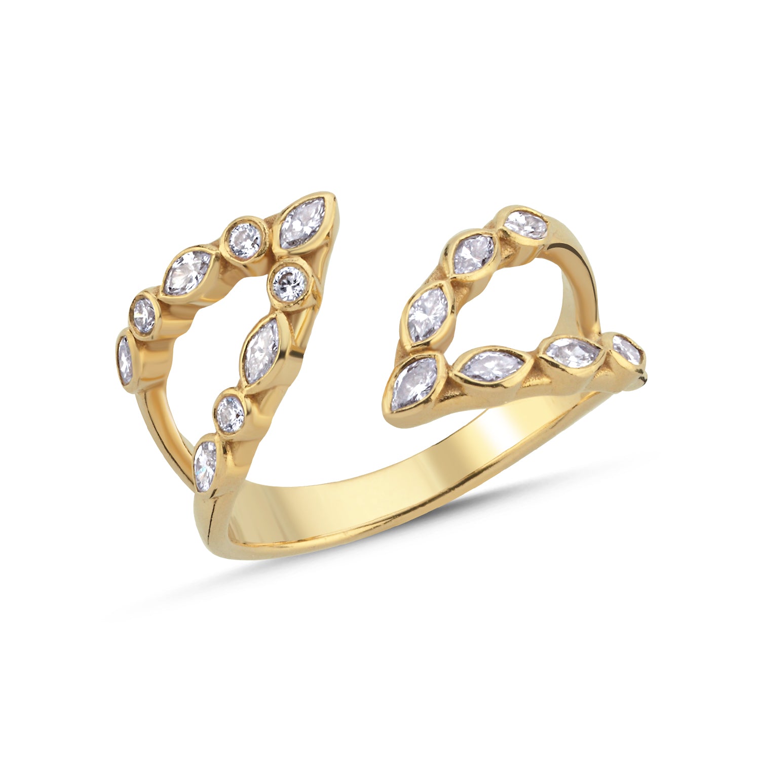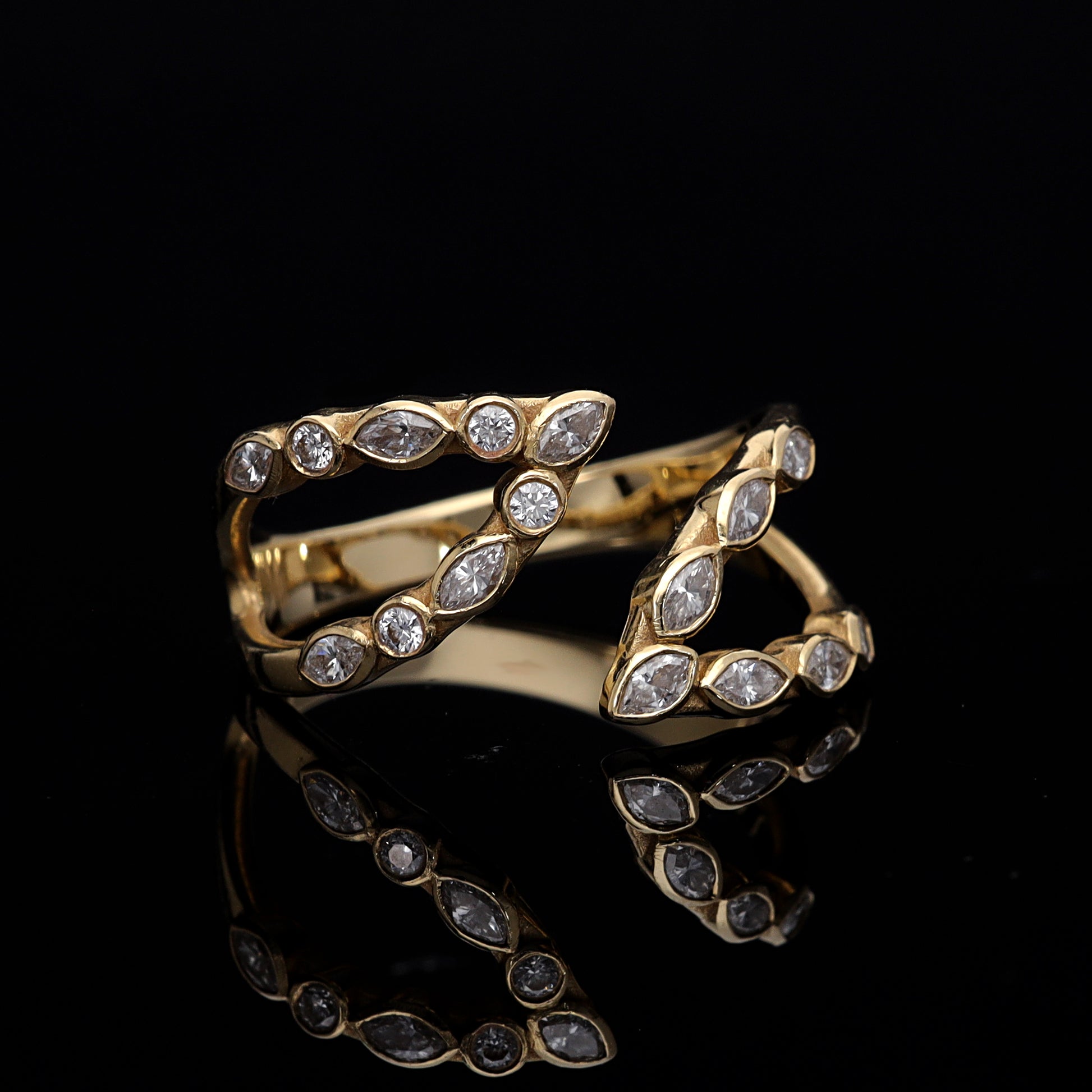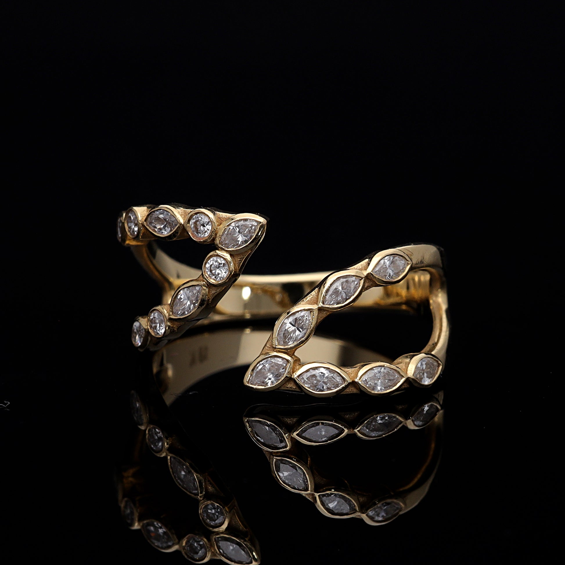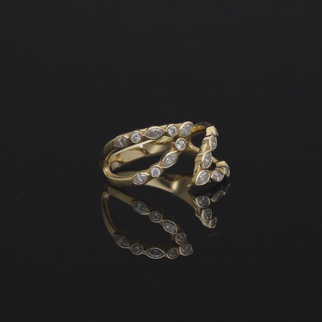 The Wishbone Diamond Ring is crafted in 18k yellow gold and shaped into a sculptural split-shank silhouette inspired by the gesture of making a wish and the iconic wishbone form. Each wing is lined with round and marquise-cut diamonds arranged as a deliberate mosaic, reflecting light softly as the two sides curve toward one another while leaving a sliver of open space — a symbol of the path still ahead and the beauty yet to come.
